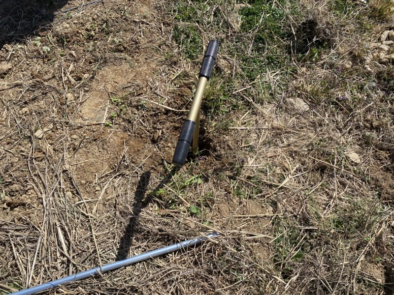 石が多い土地で石にあたるたびにとりながら掘りすすめるのがとてもつらい。石を掘ってとっていると穴径がひろがって支柱位置もきづかぬまにずれてしまっていたりします。
