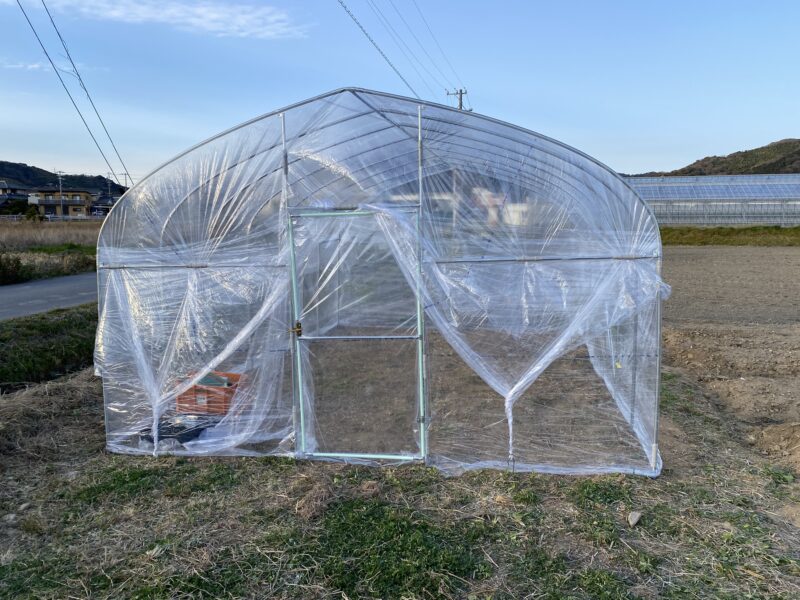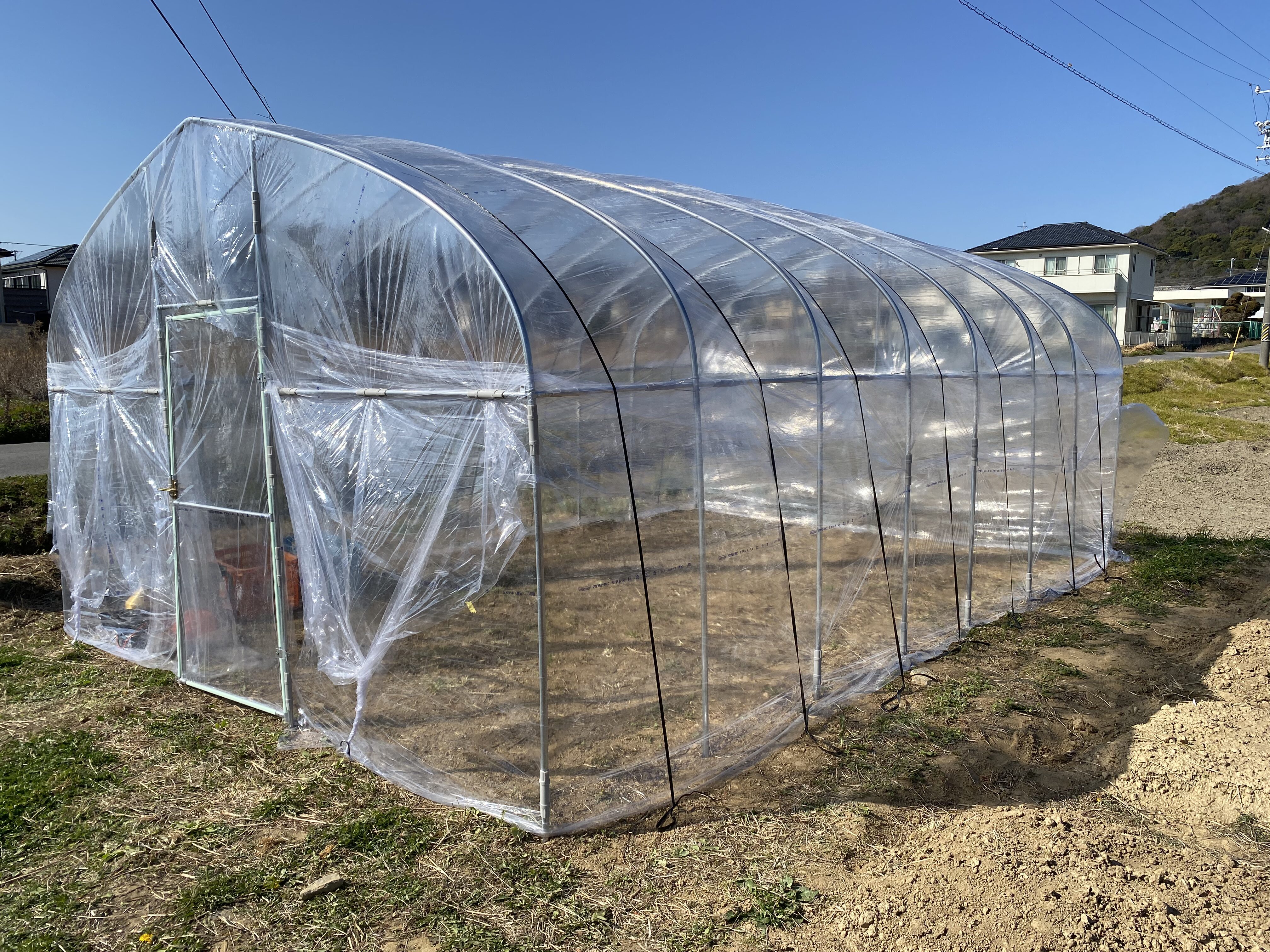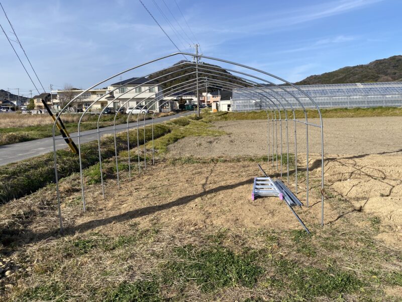 前回の続きのビニルハウス建てを土日でなんとか完了させました。初心者でパイプの加工技術がありませんので、「農業屋 6坪用ビニルハウス」を購入して建てています。